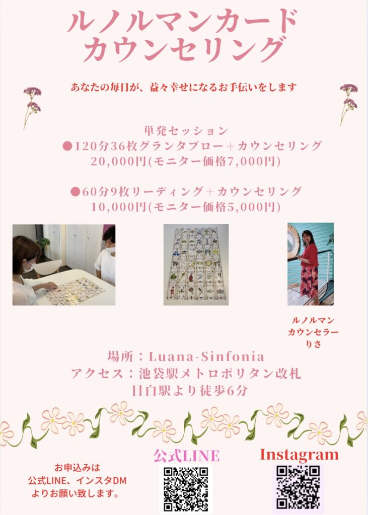 📍 場所:Luana-Sinfonia(池袋駅メトロポリタン改札 / 目白駅より徒歩6分)🕛 セッションメニュー:🔹 120分36枚グランタブロー+カウンセリング → 20,000円(モニター価格 7,000円)🔹 60分9枚リーディング+カウンセリング → 10,000円(モニター価格 5,000円)