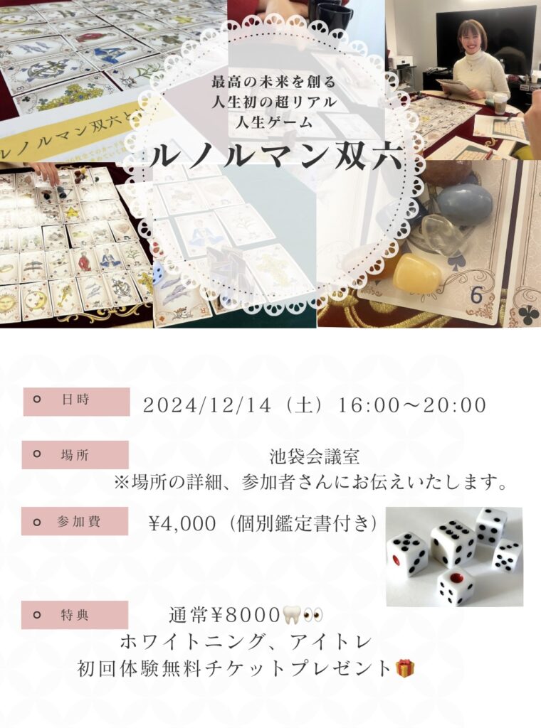 📍 場所:池袋会議室(詳細は参加者にお伝えします)💰 参加費:4,000円(個別鑑定書付き)🕕 時間:16:00 ~ 20:00🎁 特典:通常8,000円のホワイトニング初回体験無料チケット🎁